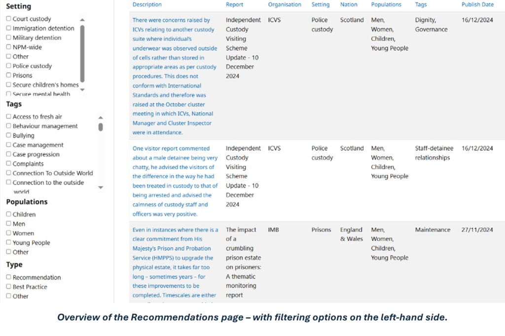 Beyond its core purpose of serving as a central system for UK NPM findings, a key feature of the Reporting Dashboard is its ability to facilitate knowledge sharing. For example, a prison governor can quickly access a list of recommendations or best practices from other prisons across the UK. This kind of knowledge exchange could encourage the adoption of more successful strategies and can drive meaningful improvements in detention.